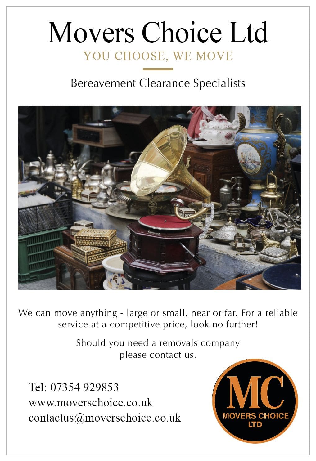 Specialising in Bereavement Clearances, Movers Choice provide a discreet and compassionate service to help families manage difficult times with dignity. Every clearance or move is handled with complete respect for both you and your possessions.